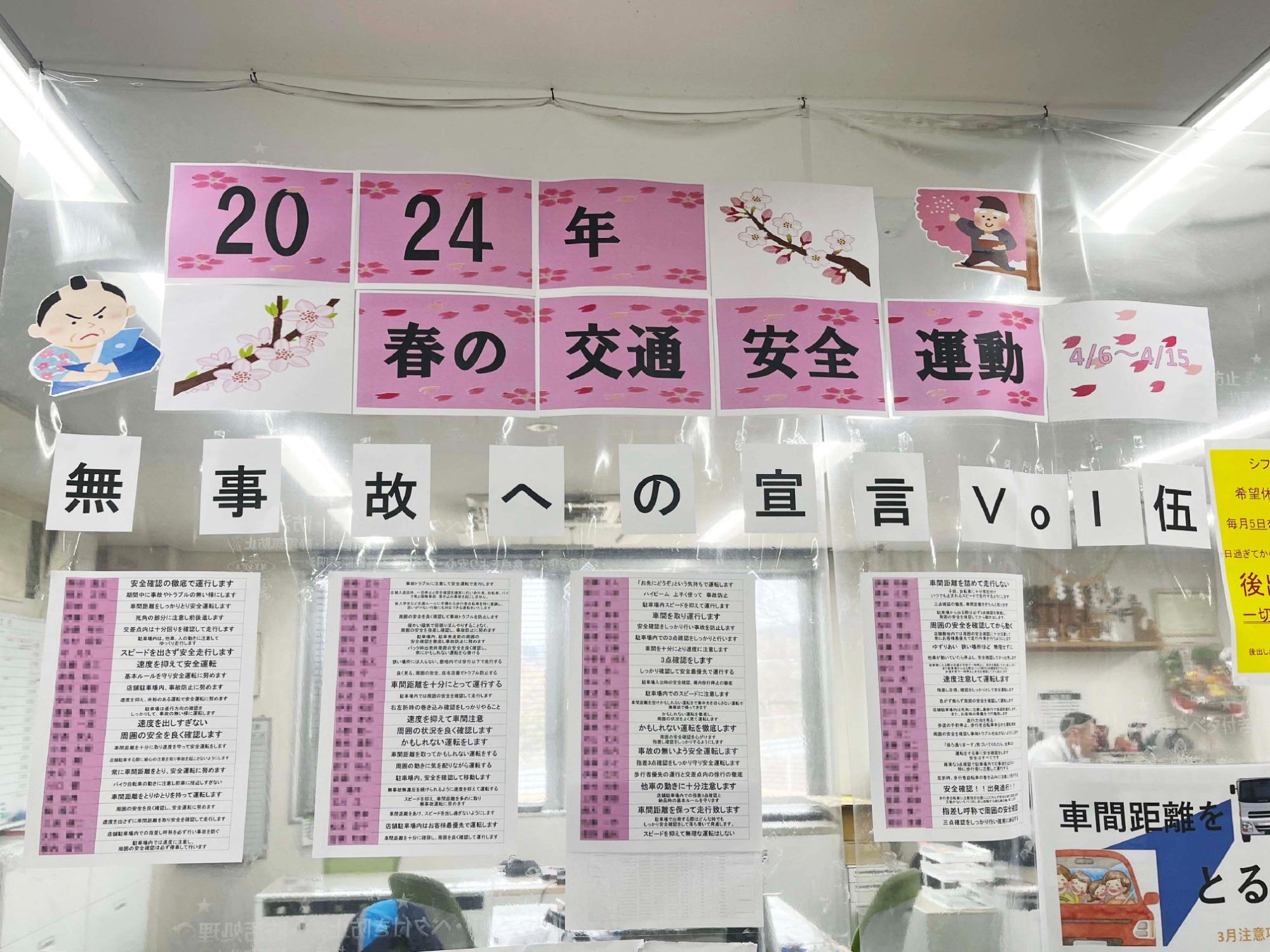 春の全国交通安全運動が 4月6日~15日までの10日間で実施され、サンファミリーでも各営業所でオリジナルのポスターや安全宣言を掲示して、交通安全運動を実施しました。