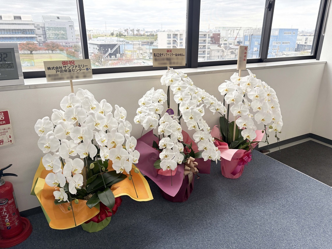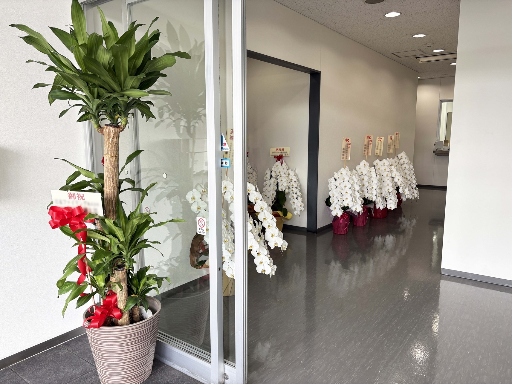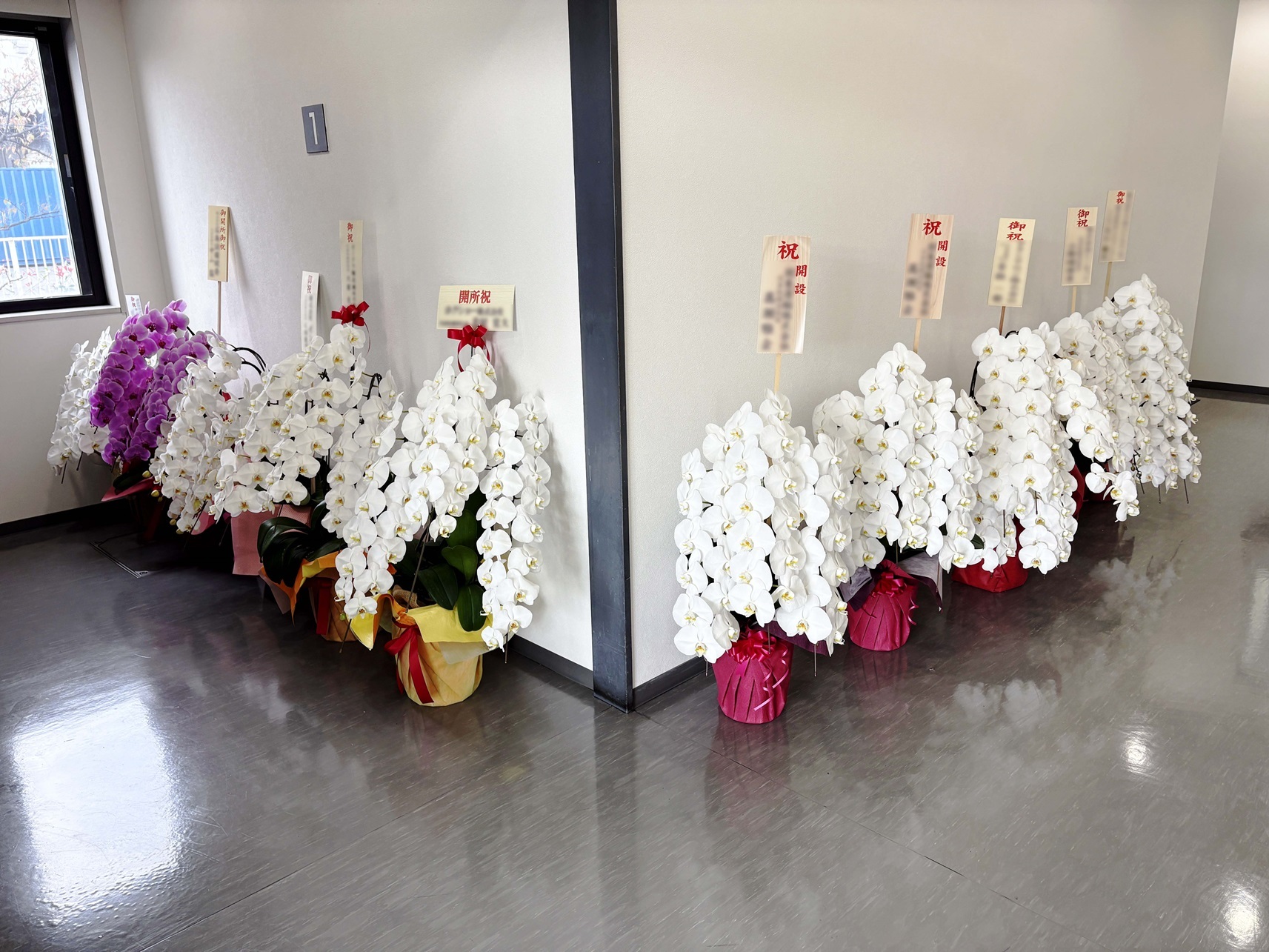 お取引先様よりオープンのお祝いに、お花やメッセージをたくさん戴きました。この場を借りて厚く御礼申し上げます。社内が立派な胡蝶蘭や観葉植物でとても華やかになり 社員一同癒されております。お心遣い本当にありがとうございました。