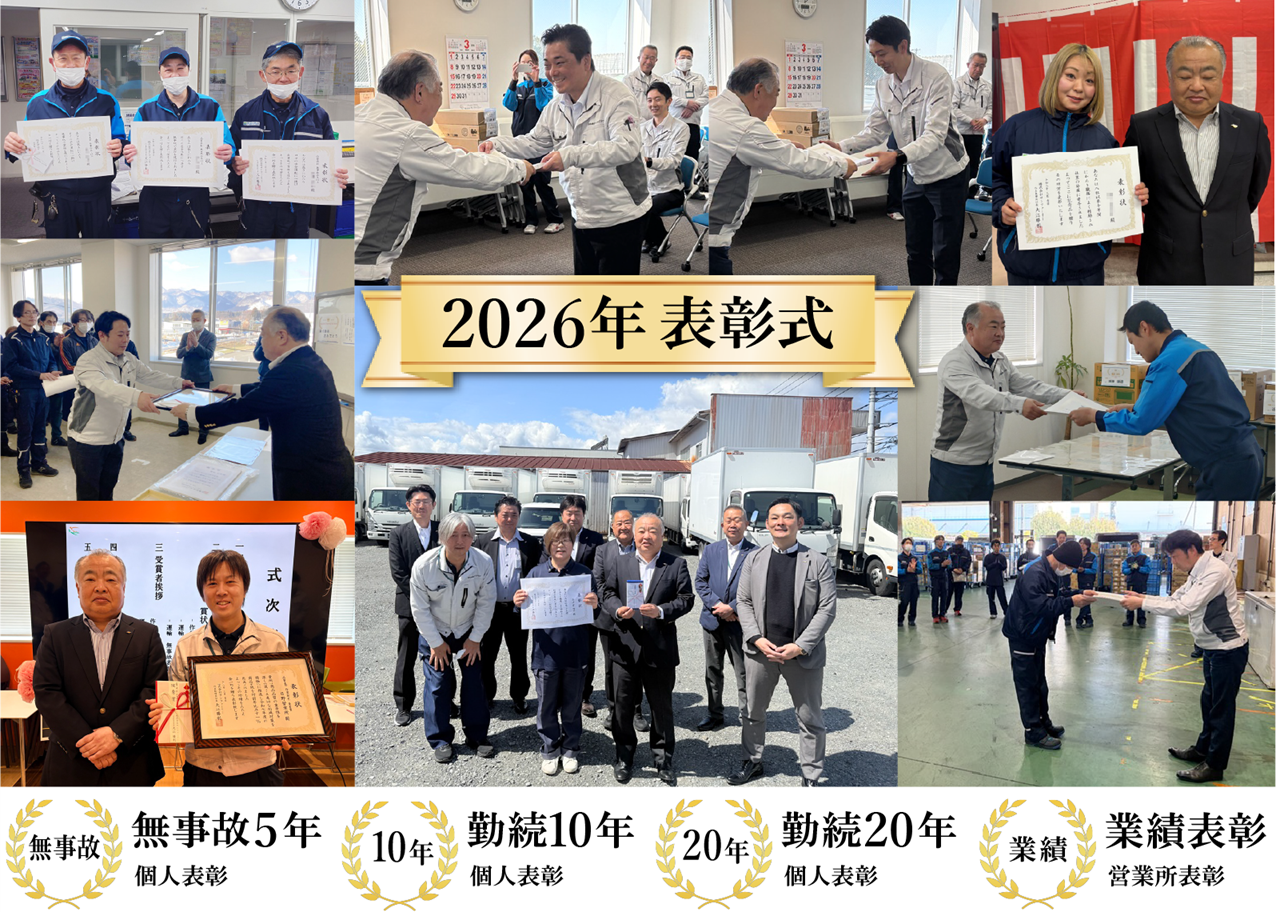 毎年、各拠点で個人表彰(10年・20年永年勤続者、5年間無事故ドライバー)と、営業所表彰(業績表彰、品質表彰)を実施しています。受賞者には賞状と記念品が贈呈され、受賞された方々をみんなで祝福しています。