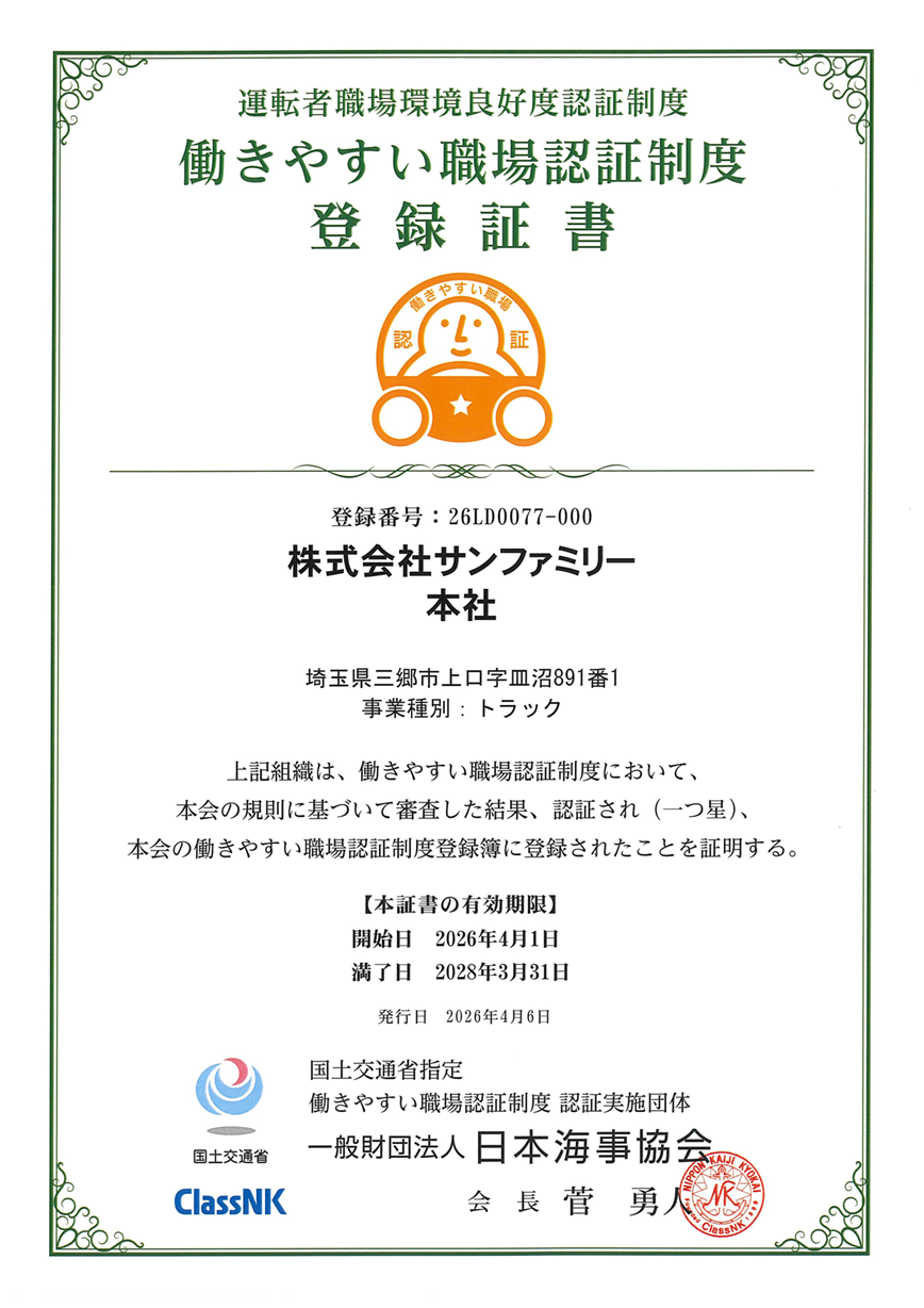 株式会社サンファミリーは、国土交通省が創設した 「働きやすい職場認証制度(運転者職場環境良好度認証制度)」 の一つ星事業者に運送認可を持つ全営業所が認定されました。(本社他18拠点)